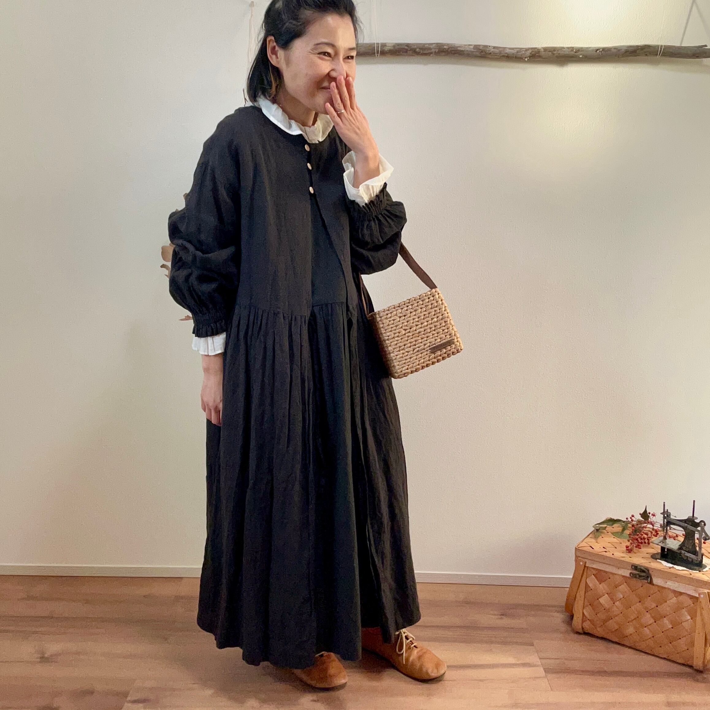 大きめサイズ✴︎110丈✴︎〈ブラック〉薄手リネン割烹着ワンピース