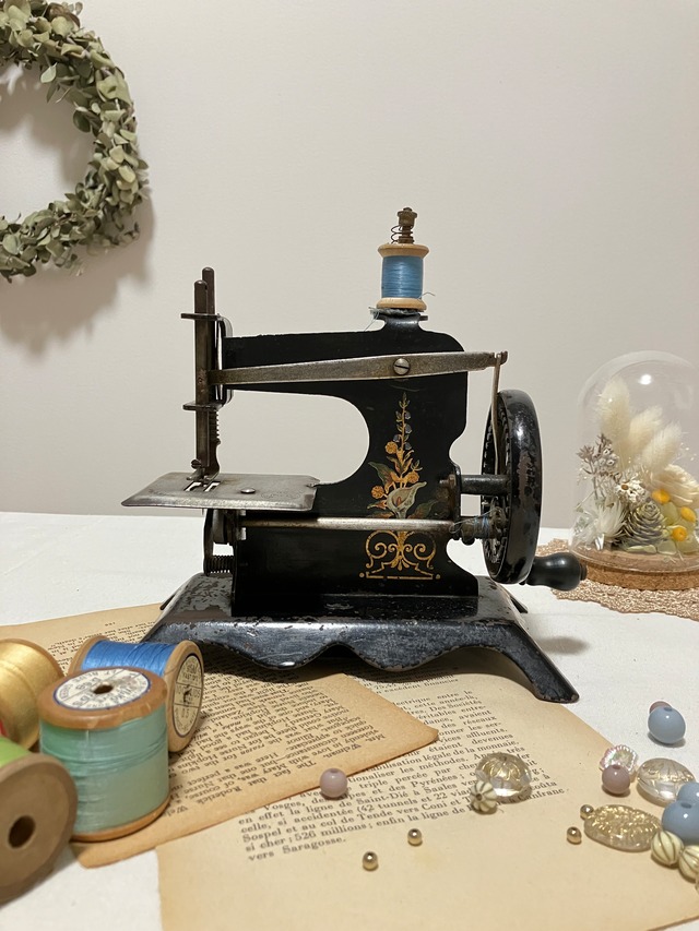ドイツ製 muller社 ブラック ゴールド柄 1935年以前のトイミシン サイズ:(約) 高さ13.5cm、横11.5cm、奥行き5cm ミニミニサイズ 塗装の剥がれ、錆が所々にありますが、全体的に綺麗な印象。 ハンドルは稼働しますが、使用は不可となっております。 インテリアや撮影小物に♡ ※縫うことはできません(ハンドルは回ります) アンティーク品の為、 細かな錆や削れ、変形などがあります。 予めご了承ください。 お客様都合による返品は受け付けておりません。 アンティーク品の為、交換は出来かねます。 ご理解頂いた上での、ご購入をよろしくお願いいたします。